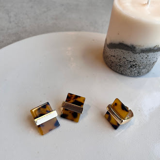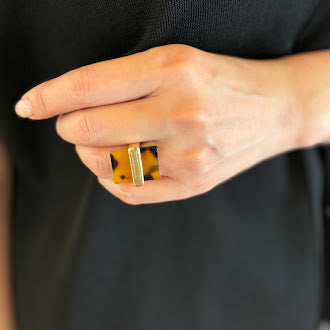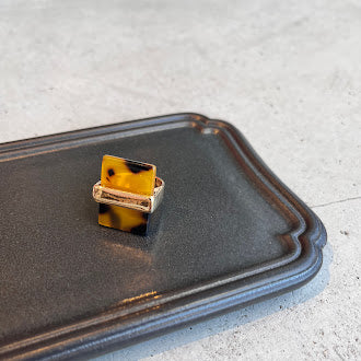 艶やかなべっ甲カラーを、すっきりとしたスクエアフォルムに落とし込んだデザインリング。落ち着いた色味は大人の手元に馴染み、カジュアルにもシックにも合わせやすい万能アイテムです。