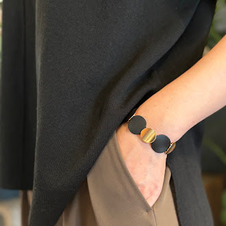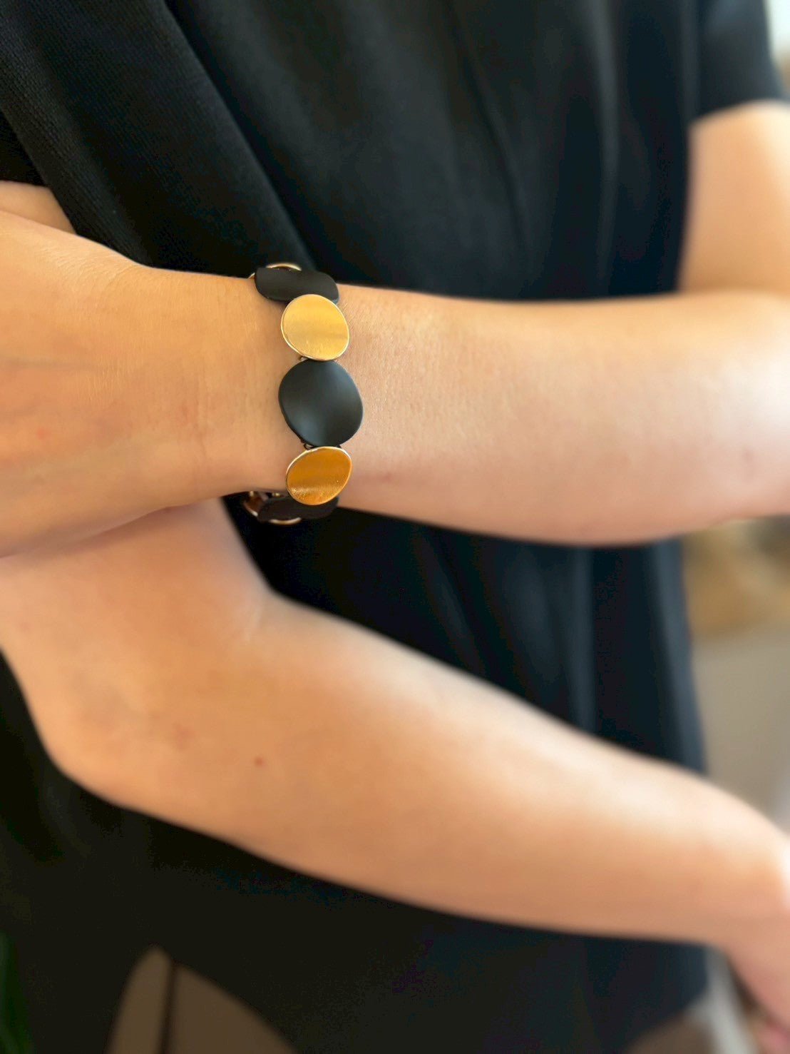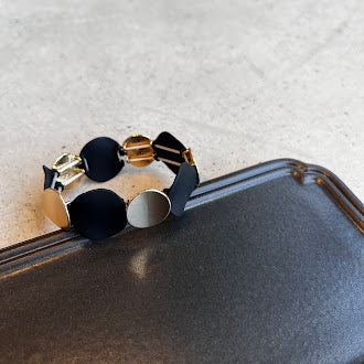 マットなブラックと艶やかなゴールドのコントラストが美しい、モダンなブレスレットです。大きさや形の異なるパーツをリズミカルに配置し、アクセントにミラーパーツやべっ甲風のクリアパーツをプラス。シンプルながらも存在感があり、手元をスタイリッシュに演出してくれます。伸縮性のあるゴム仕様で、着脱が簡単なのも嬉しいポイント。