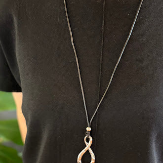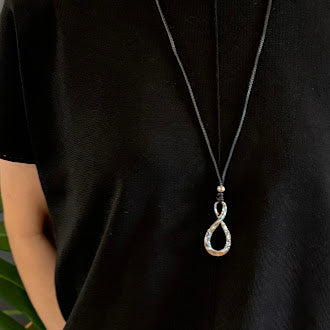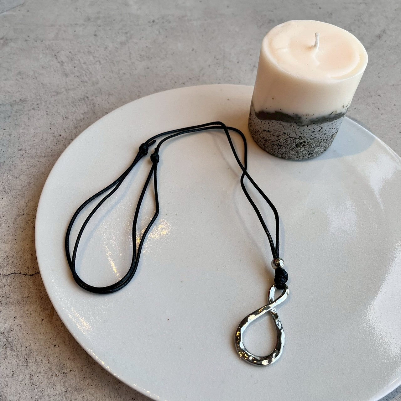 8の字モチーフをトップにあしらった、革ひものネックレス。無駄のないデザインながら、独特の存在感でコーディネートのアクセントになります。シンプルなシャツやニットに合わせるだけで、胸元に程よい抜け感とこなれた印象を与えてくれるアイテムです。